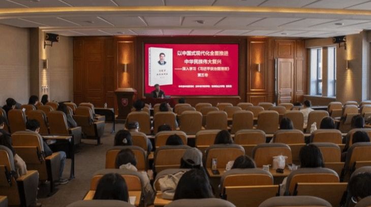 崔洪亮围绕《习近平谈治国理政》第五卷的时代背景、理论贡献与实践意义,从“全面理解第五卷的重要意义”“把握中国式现代化的内涵与路径”“认识‘两个结合’的根本途径”等方面作了系统阐释。他谈到,第五卷作为习近平新时代中国特色社会主义思想的最新成果,系统回应了一系列重大时代课题,为马克思主义中国化时代化、中华优秀传统文化传承发展与人类文明进步作出了重要贡献。他还结合教育领域实际,强调要深刻把握中国式现代化的理论体系和实践要求,正确处理若干重大关系,扎实推进教育、科技、人才一体化发展,不断夯实国家发展的战略支撑,引导师生党员进一步深刻领悟“两个确立”的决定性意义,增强“四个意识”、坚定“四个自信”、做到“两个维护”。